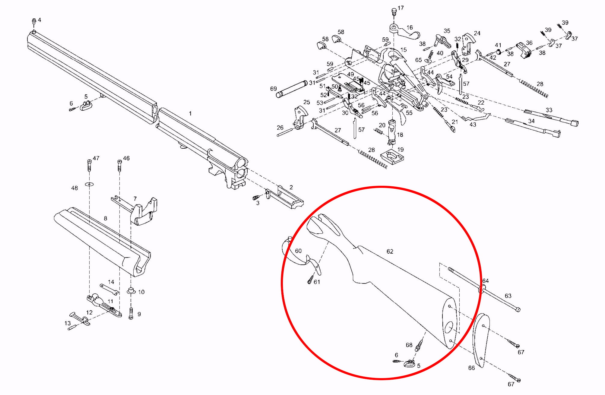 Мелкая насечка на рукоятке позволяет уверенно удерживать ружьё в перчатках, или без них.