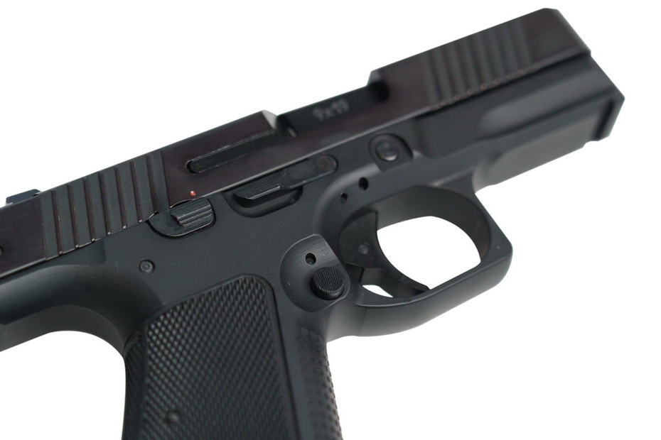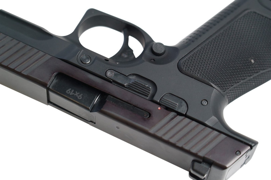 Двухсторонние органы управления: предохранитель, затворная задержка и кнопка фиксации магазина, обеспечивающие удобство манипулирования пистолетом любой рукой, в том числе в перчатках.