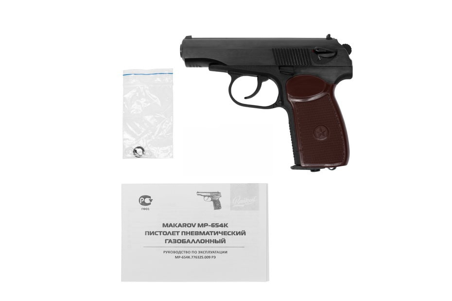 Пневматический пистолет МР-654К является газобаллонным пневматическим оружием, использующим стандартные 12г баллоны с СО2 и 4.5мм пульки. Пистолет создан на основе знаменитого пистолета Макарова ПМ и полностью повторяет его внешне и по основным приемам в обращении и стрельбе. Отличается от прототипа обновленными накладками на рукоятку. Может использоваться для начального обучения и любительской стрельбы. Пистолет находится в свободной продаже, не требует для приобретения никаких лицензий и сертификатов.